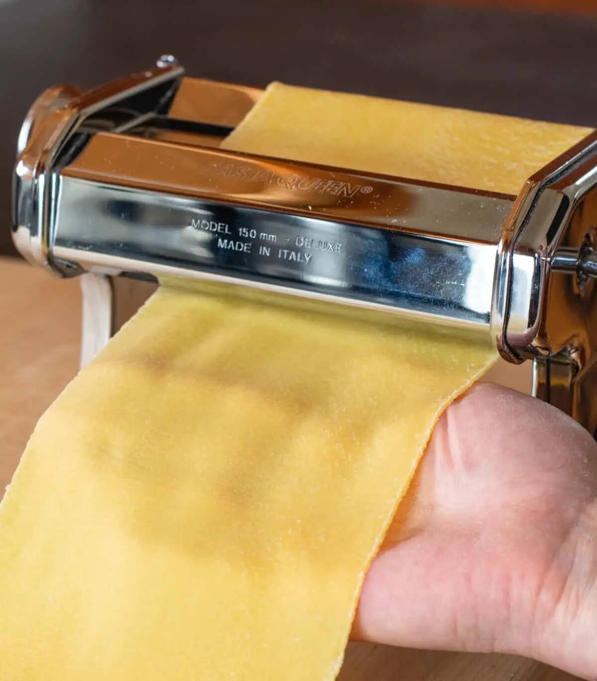 Set past roller to thickest, make the dough more pliable by rolling it several times. Flour the pasta so it doesn’t stick.