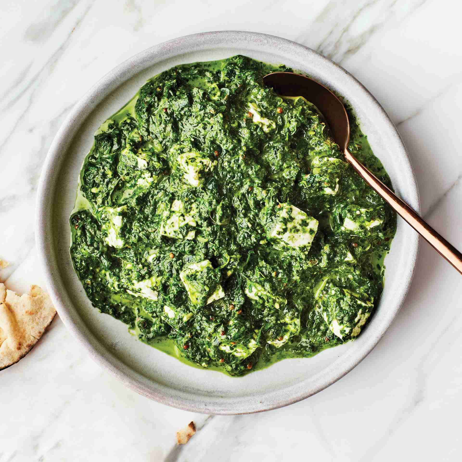 This riff on the classic dish swaps paneer out for salty chunks of feta. And while feta and spinach is an iconic combination, mozzarella or even tofu cubes are also great here.
